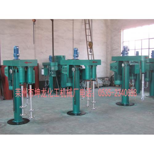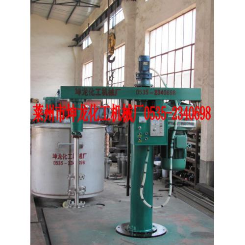 双轴分散机/高速分散机/调速分散机/高速搅拌机双轴分散机主要是针对不同粘度浆状的液体原料进行粉碎、分散、乳化、混合,通过分散盘上下剧齿的高速运转的新型高效搅拌设备,对物料进行高速的强烈的剪切、撞击、粉碎、分散,达到迅速混合、溶解、分散、细化的功能。广泛应用于涂料、固体进行搅拌分散、溶解的高效设备,广泛应用涂料、油墨、颜料、胶粘剂等化工产品,该机由液压系统、主传动、搅拌系统、导向机构、电控箱五部分组成,各部分结构紧凑、合理。分散盘型式:平盘锯齿式、三义桨式、碟式、其它形式。 主要特点:机采用电磁调速、变频调速和三速等各种规格、运转稳定有力,适合各种粘度;液压、机械两种升降形式,升降旋转自如,适应各种位置;普通及防爆配置,安全可靠,操作维护简单;生产连续性强,对物料可进行快速分散和溶解,分散效果好,生产效率高,运转平稳,安装简便。针对不同物料的粘度及处理量有不同的功率及型号。
