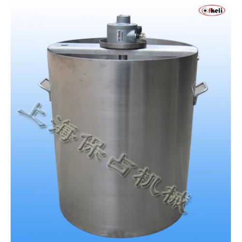 此搅拌机是固定在桶的盖子上的.可方便打开.桶盖处开三分之一 可方便看料和倒料. |