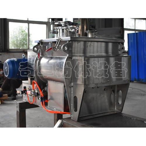 无重力混合机工作原理:卧式双轴桨叶(无重力)混合机由卧式W形容器、带(或者不带)开口的顶盖、安装有桨叶并反向旋转的双轴、传动单元、支撑架、密封件、出料结构等部件组成。由于双轴反向旋转,成一定角度的浆叶将物料沿轴向、径向循环翻搅,使物料达到均匀混合的效果。物料在混合器内的上抛运动形成流动层,产生瞬间失重,所以此系列混合机也叫做无重力混合机。