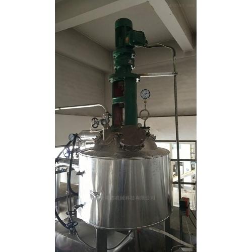 罐体、搅拌装置和间歇式高剪切乳化机或管线式高剪切乳化机组成。 慢速搅拌器是由中间的折叶桨式搅拌器与能混合高粘度的框式搅拌器组成,在框式搅拌器的周边装有刮壁的刮板,刮板的作用是使容器内壁与物料不断产生新的界面而不再留有任何死角。高速均质乳化器是由高速旋转的叶轮与具有放射状导流槽的定子而构成,经特殊设计的叶轮上下翼叶高速旋转,从而将物料从叶轮上下分别高压吸入,后经叶轮以离心力高速抛射。因叶轮与定子间有较小的间隙,所以物料在被吸入与抛出过程中经过了强烈的剪切、挤压、混合、喷射、高频震荡等一系列复杂的物理反应,从而将混合物料充分乳化,因慢速搅拌为同速逆向左旋不断进行,从而使整个容器内的物料由上而下不断循环进行混合、分散、均质、乳化。