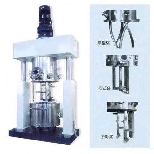 行星搅拌机是一种新型高效无死点混合搅拌设备,它具有独特、新颖的搅拌形式,釜内有两根或三根多层桨叶式搅拌器和一至两个自动刮刀,搅拌器在绕釜体轴线公转的同时,又以不同的转速绕自身轴线自转,使物料在釜体内做复杂的运动,受到强烈的剪切和搓合。此外设备内的刮壁刀绕釜体轴线转动,将粘在壁上之物料刮下参与混合,使其效果更为理想。釜体采用特殊密封结构,可进行加压及抽真空,具有良好的排气除泡效果。缸体夹套可根据用户需要进行加热,冷却。出料方式为压料式,设备缸盖可液压升降,缸体可自由移动,操作十分简单。而且搅拌桨及刮刀可随横梁上升而完全脱离缸体,便于清洁。