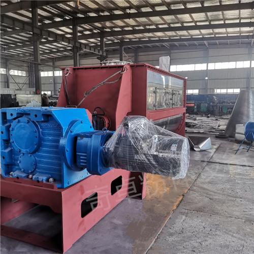 螺带混合机设备各种分组的物料按配方比例经过计量后进人混合机,物料在带状螺旋叶片的推动下进行混合。外螺带将物料从一端向另一端推动,内螺带则使物料向相反的方向运动,里层物料被推到一侧后由里向外翻滚,外层物料被推到另一侧后由外向里翻滚。物料在对流过程中二股物料流相互渗透、变位而进行混合,在两侧翻滚过程中再进行混合,这样反复进行多次,后通过出料控制机构将混合均匀后的物料从卸料门卸出。