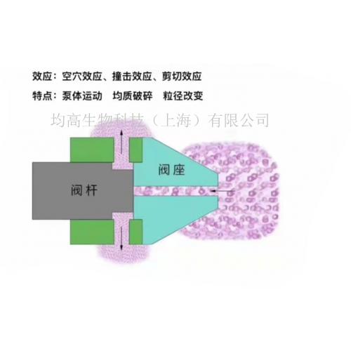 Sample先以高压低流速的状态进入均质阀,产生超剧烈的能量,此能量伴随着剪切、空穴及撞击三效应将固体颗粒、细胞粉碎。