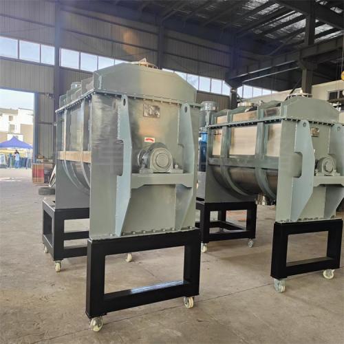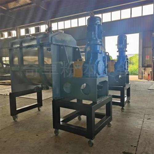 卧式双轴螺带混合机是搅拌干的、粉状的物料,起到搅拌混合均匀的目的。搅拌时机内物料受两个相反方向运动的转子运动,进行着复合运动,双轴桨叶带动物料沿着机槽内壁做顺逆两个时针旋转,靠近轴心处物料做轴心旋转,轴向由内至两侧推动,外螺旋带动靠近筒壁物料做轴心旋转,轴向由两侧至内推动,于是造成物料筒体内对流循环、剪切渗混,完成物料在较短时间内快速均匀混合。