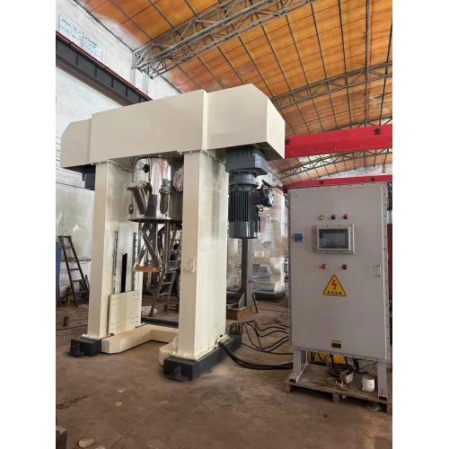 工作原理:行星架转动时,带动箱内的二根搅拌框、一根刮壁轴、一根分散轴绕料桶轴线进行公转,搅拌框、刮壁轴同速自转,分散轴在公转的同时高速自转,从而使物料受到强烈的剪切、捏合作用,达到充分分散和混合的目的;刮壁板紧贴桶壁的刮试,使桶壁无滞留料。
