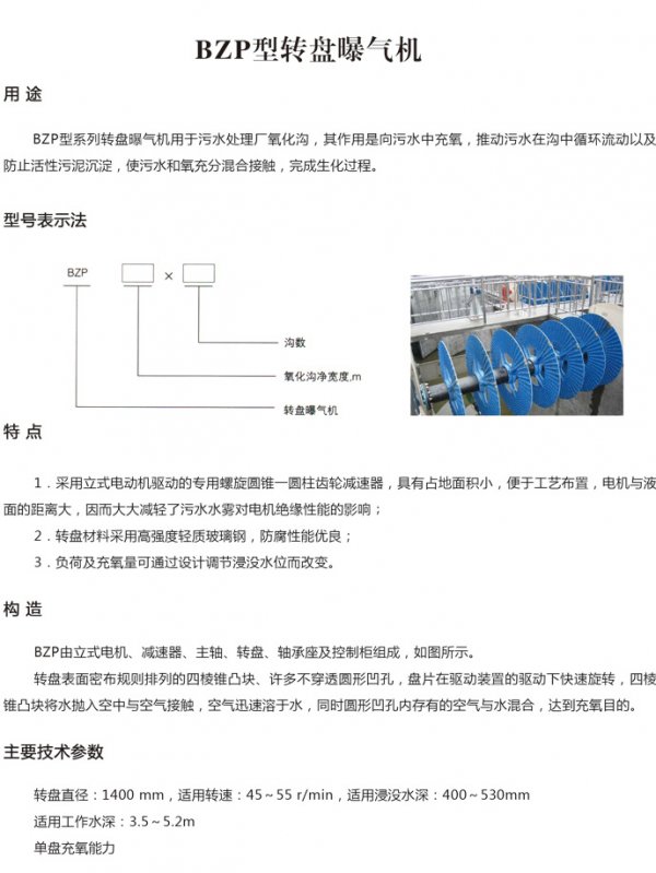 BZP型系列转盘曝气机用于污水处理厂氧化沟,其作用是向污水中充氧,推动污水在沟中循环流动以及防止活性污泥沉淀。