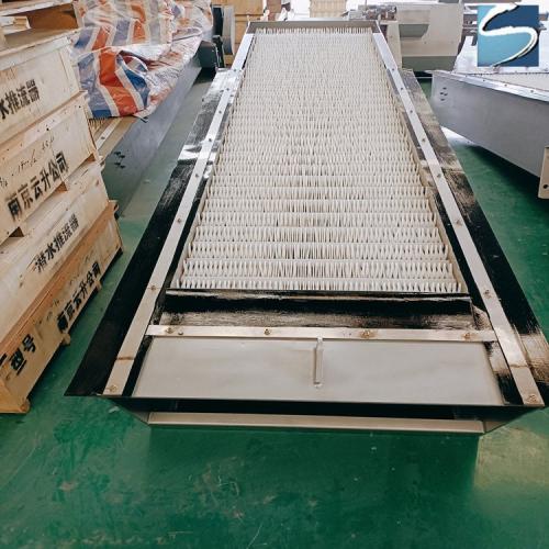 该设备是由ABS工程塑料、尼龙或不锈钢制成的特殊形耙齿,按一定的排列次序装在耙齿轴上形成封闭式耙齿链,其下部装在进水渠水中。当传动系统带动链轮作匀速定向旋转时,整个耙齿链便自上而下运动,携带固体杂物从液体中分离出来,流体通过耙齿间隙流出去,整个工作状态连续进行。